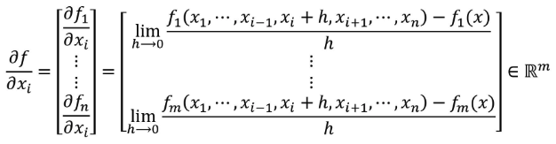 n에서 m차원으로 mapping 되는 위 vector-valued function의 partial derivative를 구하면 아래와 같다.