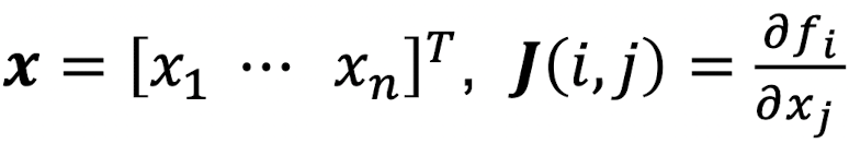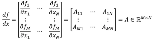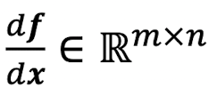 이때 input인 x는 다음과 같은 n차원의 column vector 형태를 띄며, 주어진 Jacobian은 "i 번째 output의 변화량 / j 번째 input의 변화량"을 의미한다.
