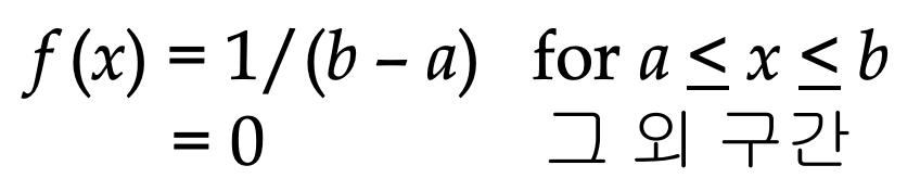확률변수 X의 Probability density function이 다음과 같이 주어지면, X를 구간 (a,b)에서 Uniform random variable이라 한다.