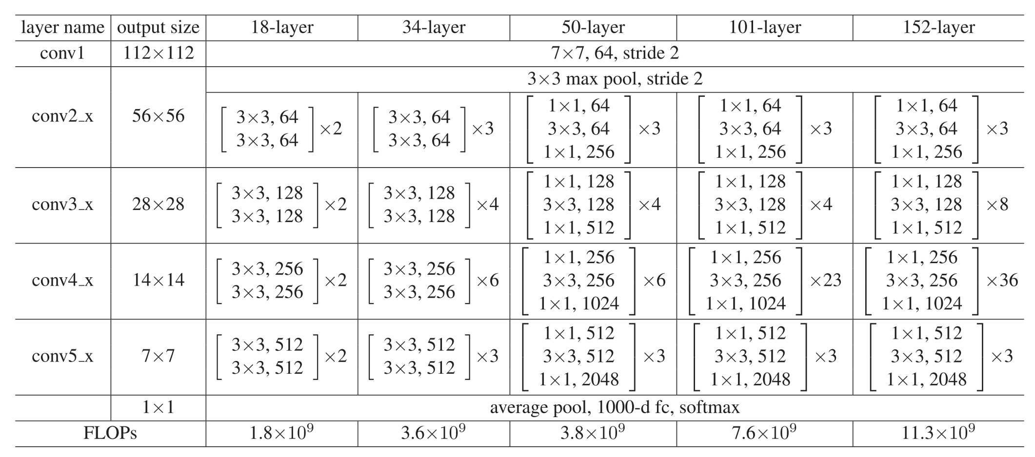 이제 여기 보이시는 것처럼 layer을 얼마나 쌓느냐에 따라 ResNet 구조에 차이가 생깁니다.