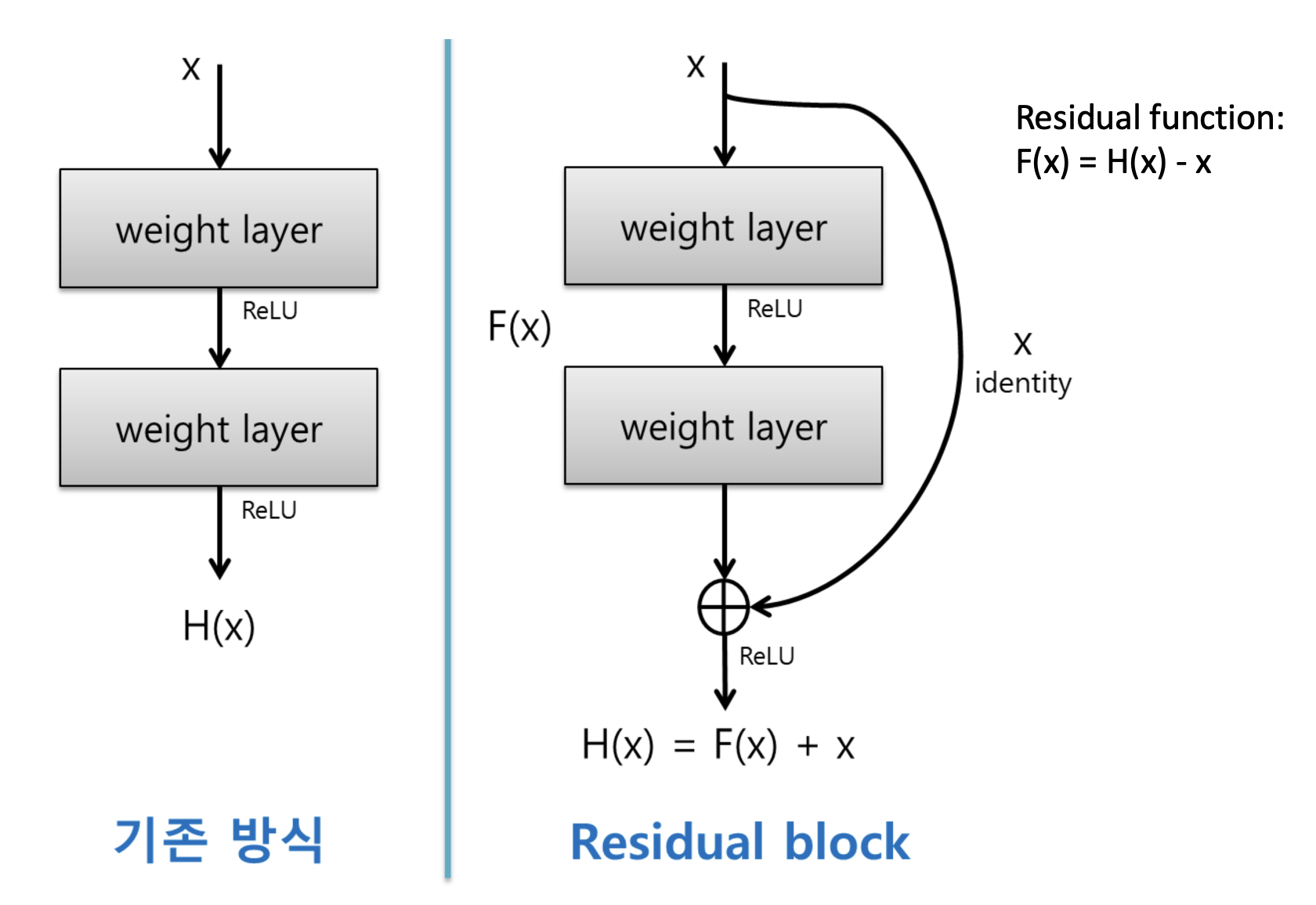 기존 방식은 input으로 x를 받아서 두개의 weight layer을 거치고, 학습을 통해 최적의 출력 H(x)를 구하는 것이 목표입니다.