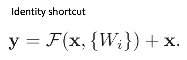 여기 보이는 것처럼 두개의 convolutional layer를 뛰어넘는 인풋 feature map인 x를 output에 더해주는 구조를 ShortCut이라고 부릅니다.